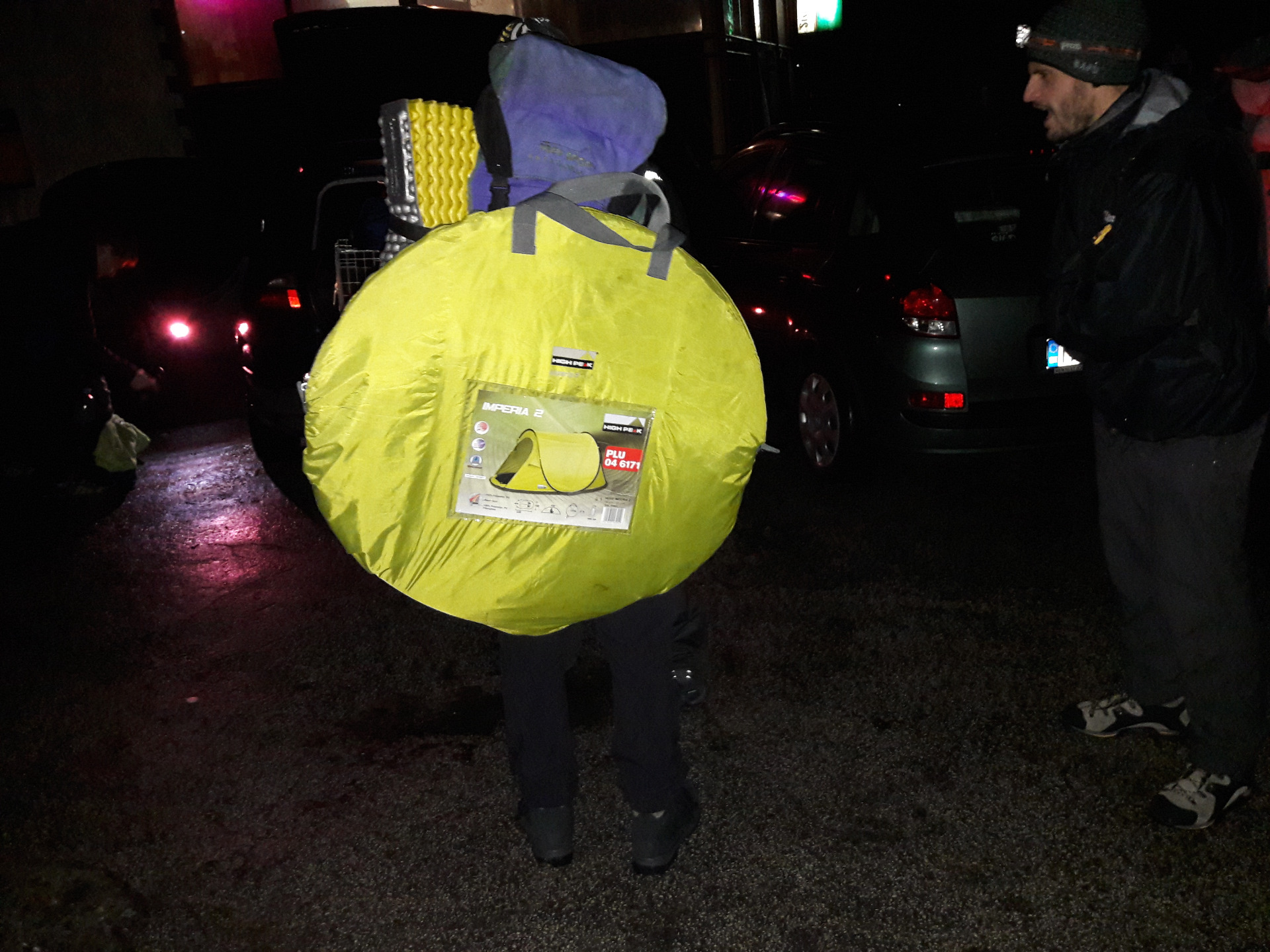 Okolo pol desiatej už neprší a tak vyrážame. Pri nakladaní ruksakov na chrbát si vyslúžil nejeden úsmev Peťo, ktorý sa rozhodol zahrnúť do svojej výstroje festivalový stan o priemere vojenského satelitu. Hovoríme o rozmere v zloženom stave. Argumentuje tým, že stan stačí vyhodiť do vzduchu a na zem dopadne postavený.