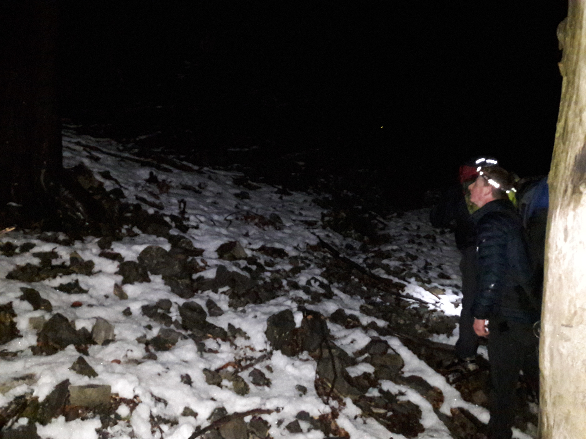 Pôvodný plán bol vystúpiť na Bartalovú okolo Modranských skál. Peťo však vyhodnocuje situáciu inak a preberá vedenie na štýl "zodpovedný otec". Chce, aby sme na hrebeň vystúpili po zvážnici. Zvážnicu sme aj našli, ale po daždi bola dokonale blatistá a šmykľavá. Jeden krok hore, dva kroky dole. Volíme cestu cez krkaháje povedľa zvážnice. Do tmy sa sem tam ozývajú hrubé výrazy, keď nejeden člen partie chytí na blate šmyk.