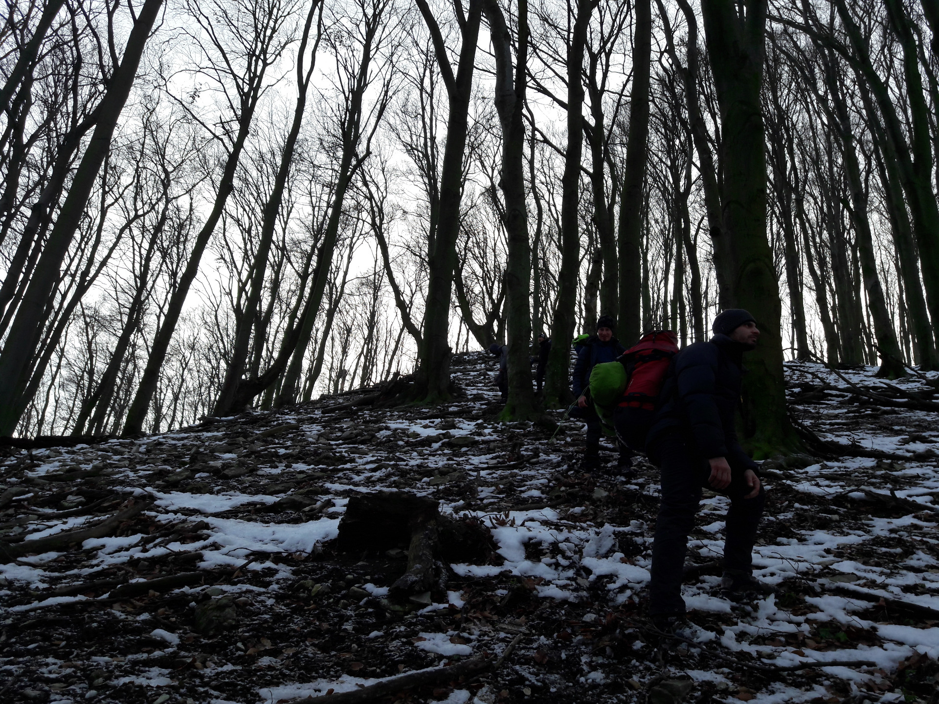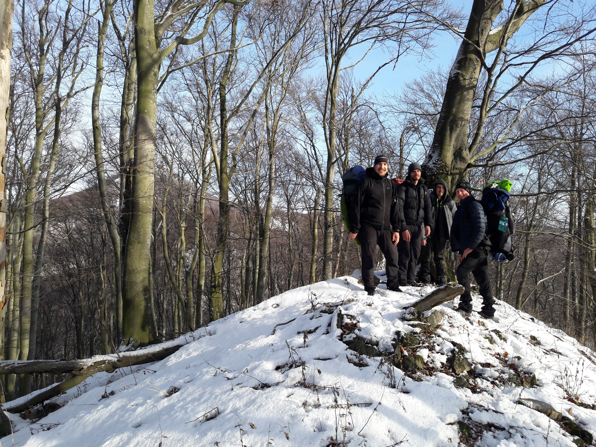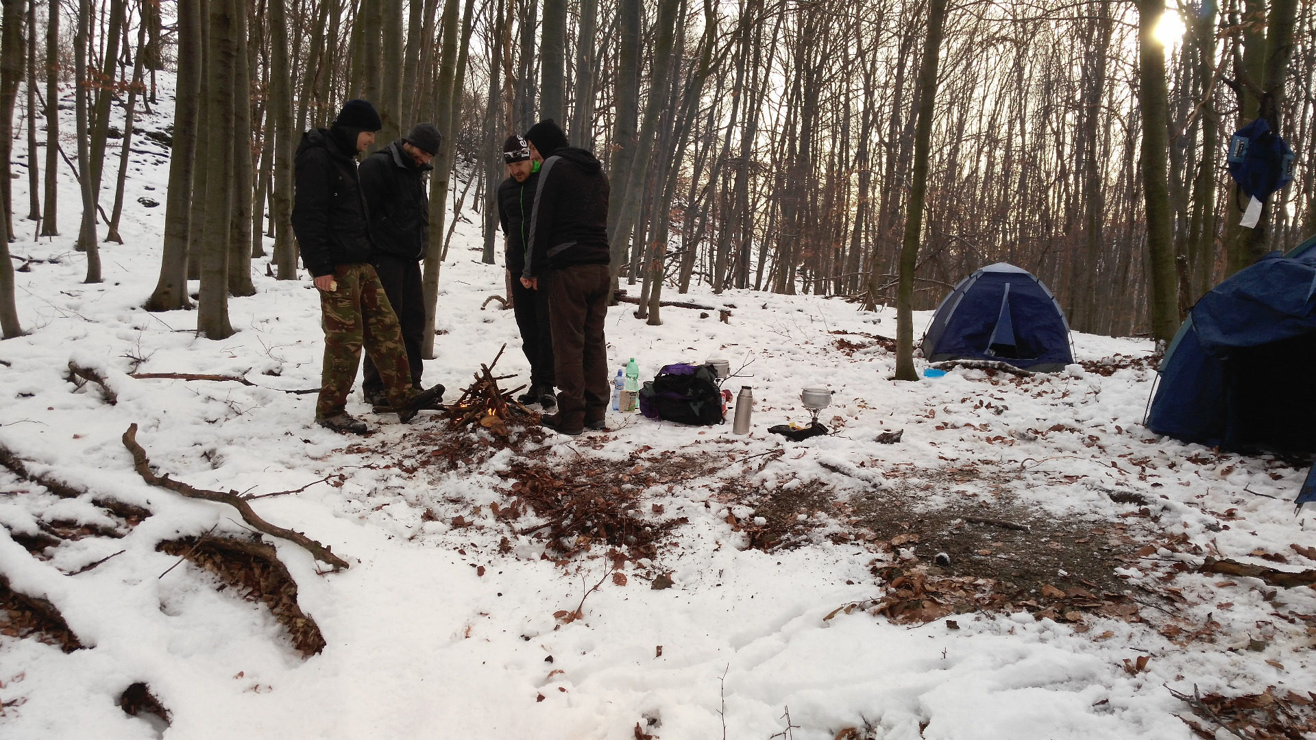 Nakoniec sa vyškriabeme na hrebeň, kde sa našťastie drží sneh. Kráčame smerom k vrcholu Bartalovej a motáme sa po kadejakých chraštinách. Nakoniec nás stopy zveri privedú na pekný flek ako stvorený pre rozloženie stanov. Samotné rozkladanie stanov bola kapitola sama o sebe. Peťo naozaj vyhodil svoj fesťákový stan do vzduchu a naozaj ho mal hneď rozložený, zato ja s Paľom sme vyberali a súkali tyčky do stanu asi na trikrát. Teraz už viem, že tyčky stanu značky Coleman majú tupé a ostré konce, ktoré si neradno zmýliť.