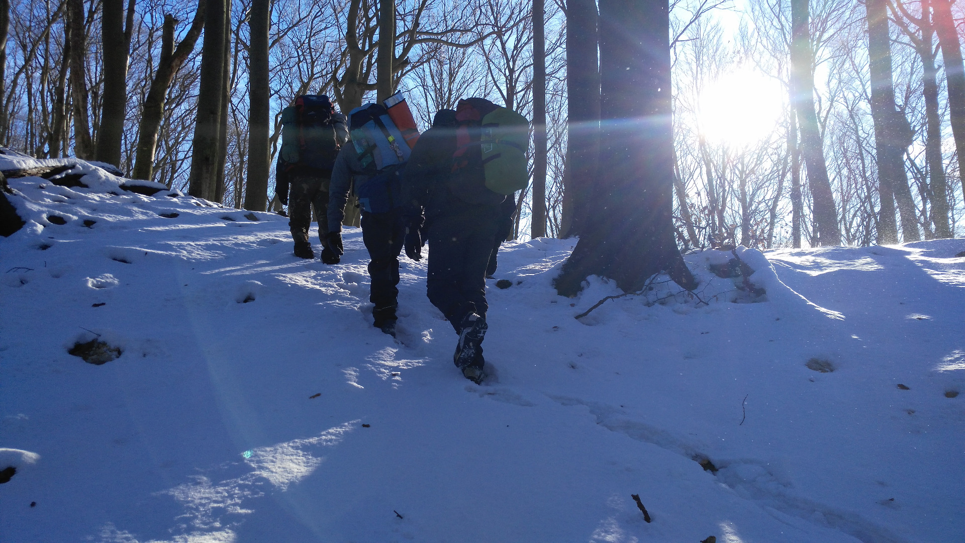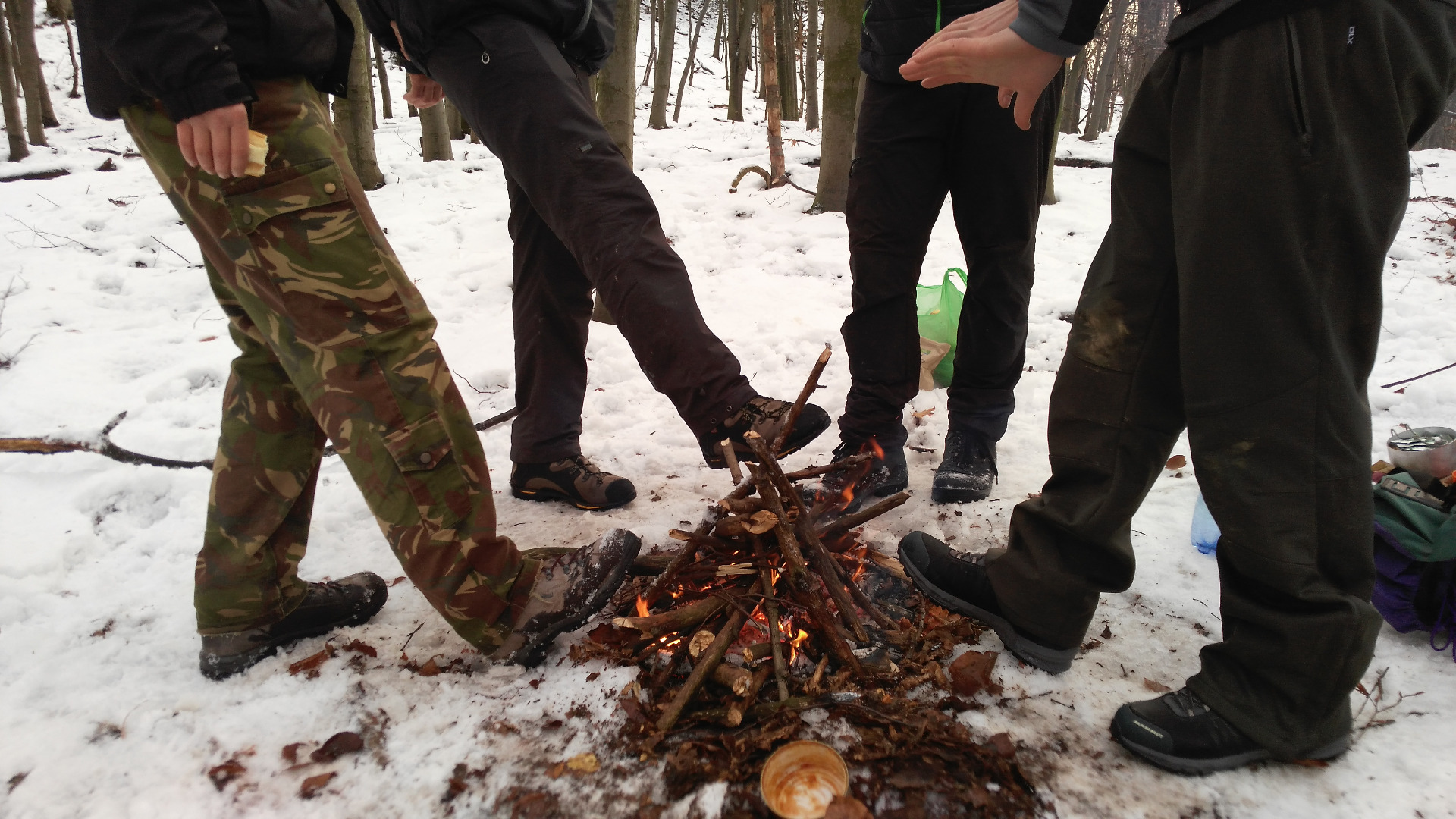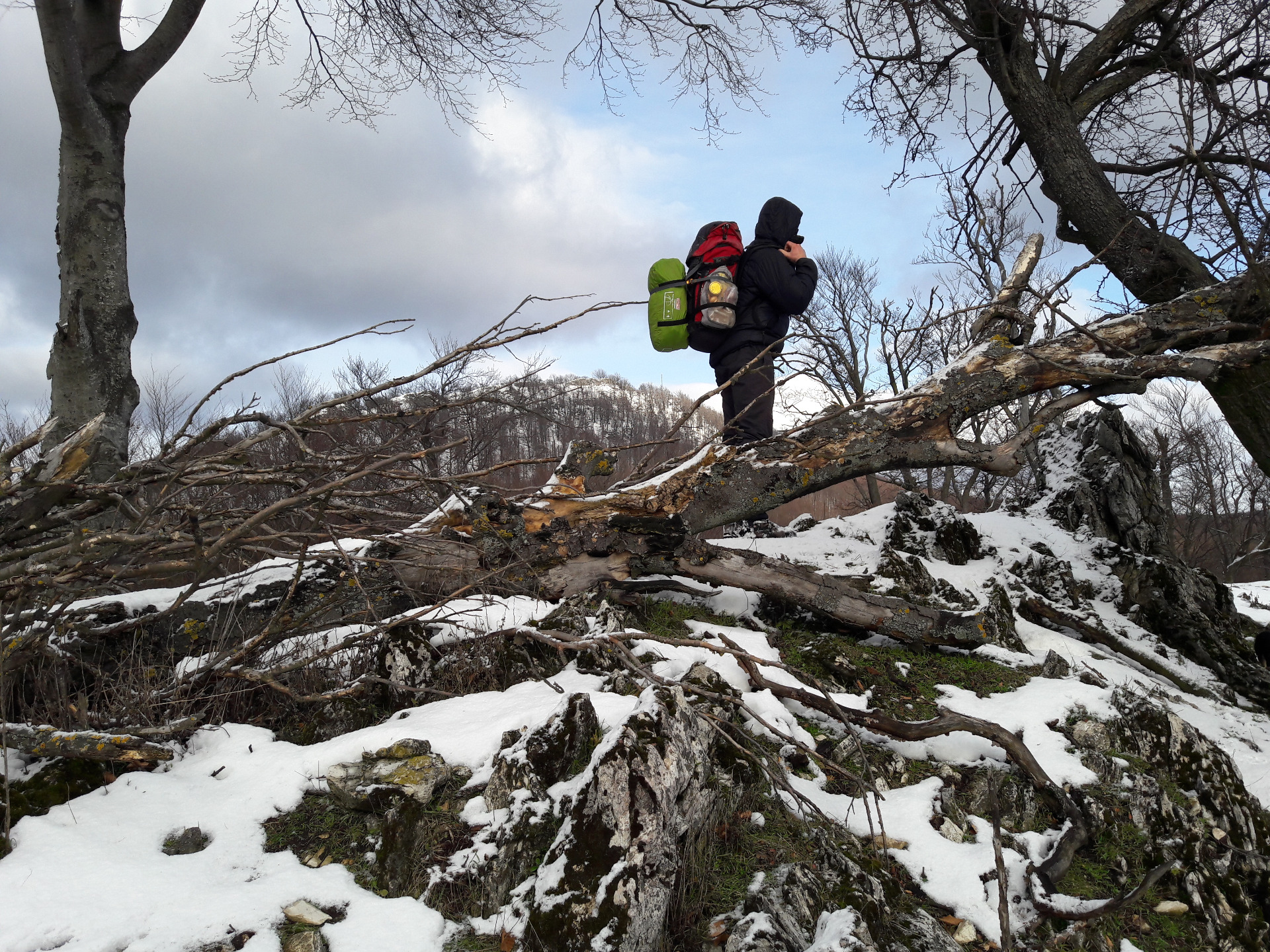 Nakoniec sa vyškriabeme na hrebeň, kde sa našťastie drží sneh. Kráčame smerom k vrcholu Bartalovej a motáme sa po kadejakých chraštinách. Nakoniec nás stopy zveri privedú na pekný flek ako stvorený pre rozloženie stanov. Samotné rozkladanie stanov bola kapitola sama o sebe. Peťo naozaj vyhodil svoj fesťákový stan do vzduchu a naozaj ho mal hneď rozložený, zato ja s Paľom sme vyberali a súkali tyčky do stanu asi na trikrát. Teraz už viem, že tyčky stanu značky Coleman majú tupé a ostré konce, ktoré si neradno zmýliť.