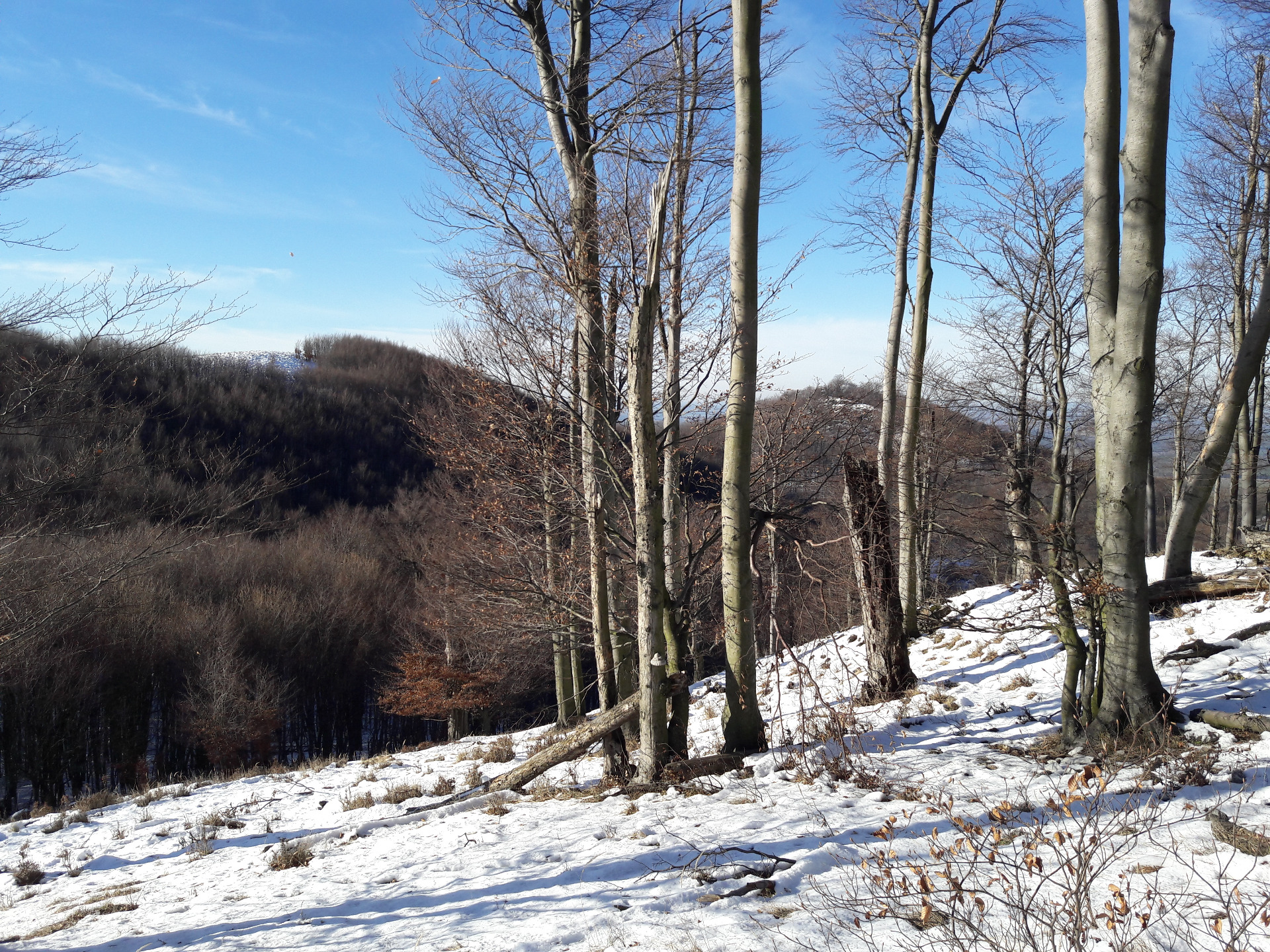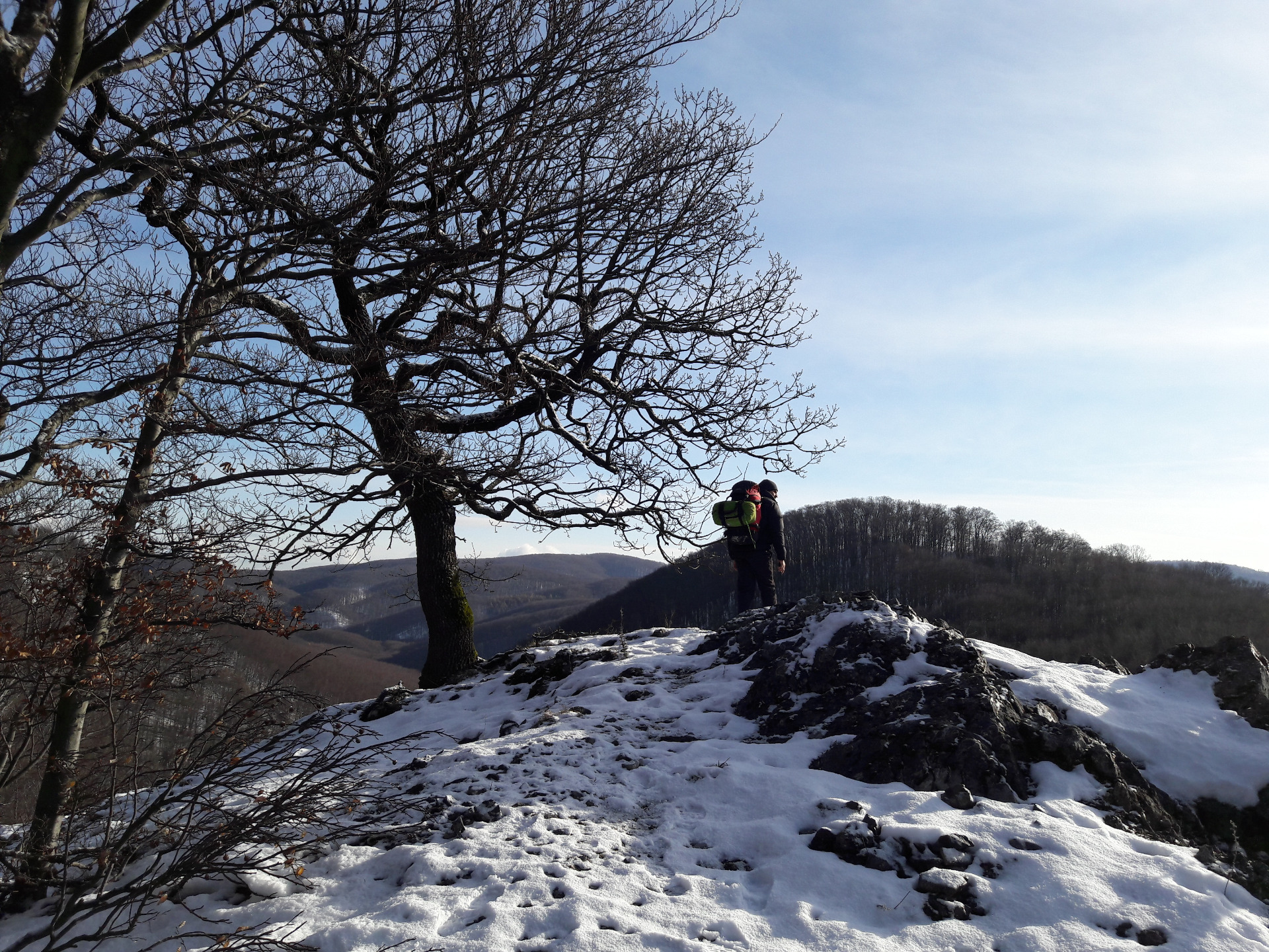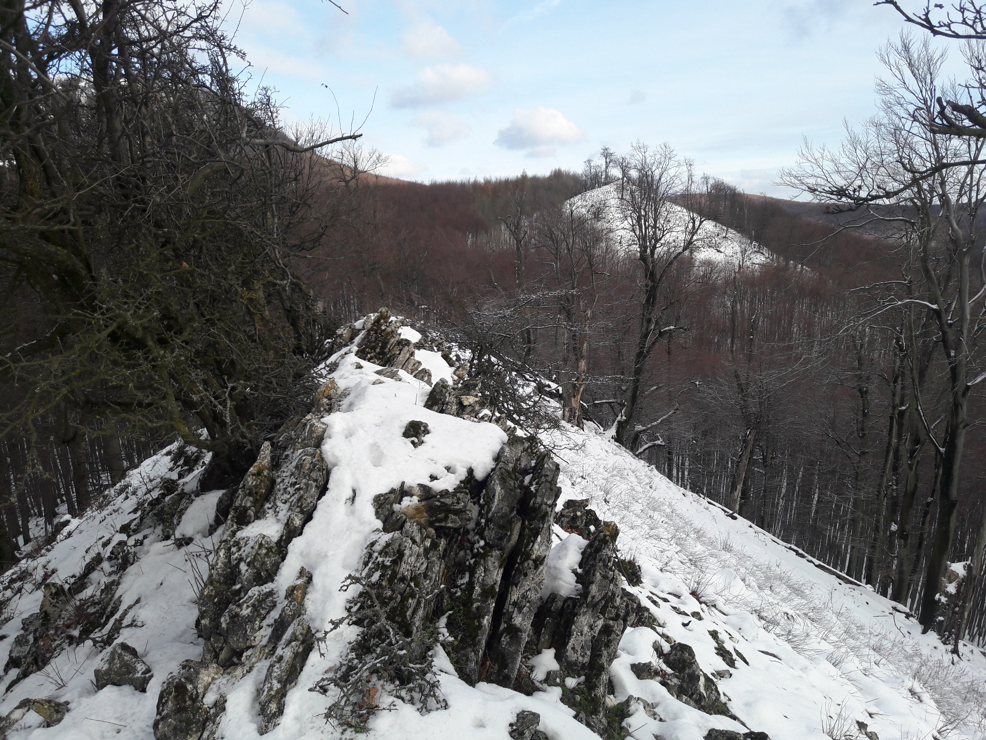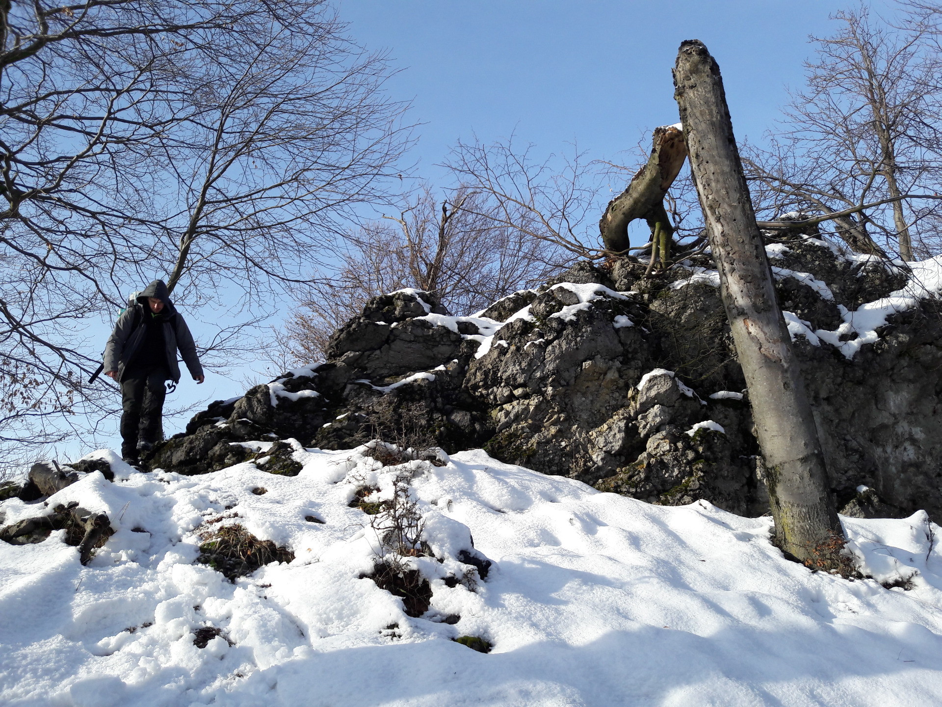 Čaká nás strmý výstup kde musíme všetko nastúpať odznova. Kopec, na ktorý smerujeme, sa v niektorých mapách uvádza ako Soľný vrch, v iných ako Snežný vrch. Výstup je samozrejme radikálny diktát, priamo a bez zbytočných rečí. Na vrchole je naša námaha odmenená pekným skalnatým hrebienkom a výhľadmi na Vysokú a množstvo kopcov smerom na juh. Zároveň sa však do nás opiera prudký mrazivý vetrík severáčik, tak si čajovú prestávku doprajeme až nižšie v sedle. No ešte pár záberov zo Snežného vrchu: