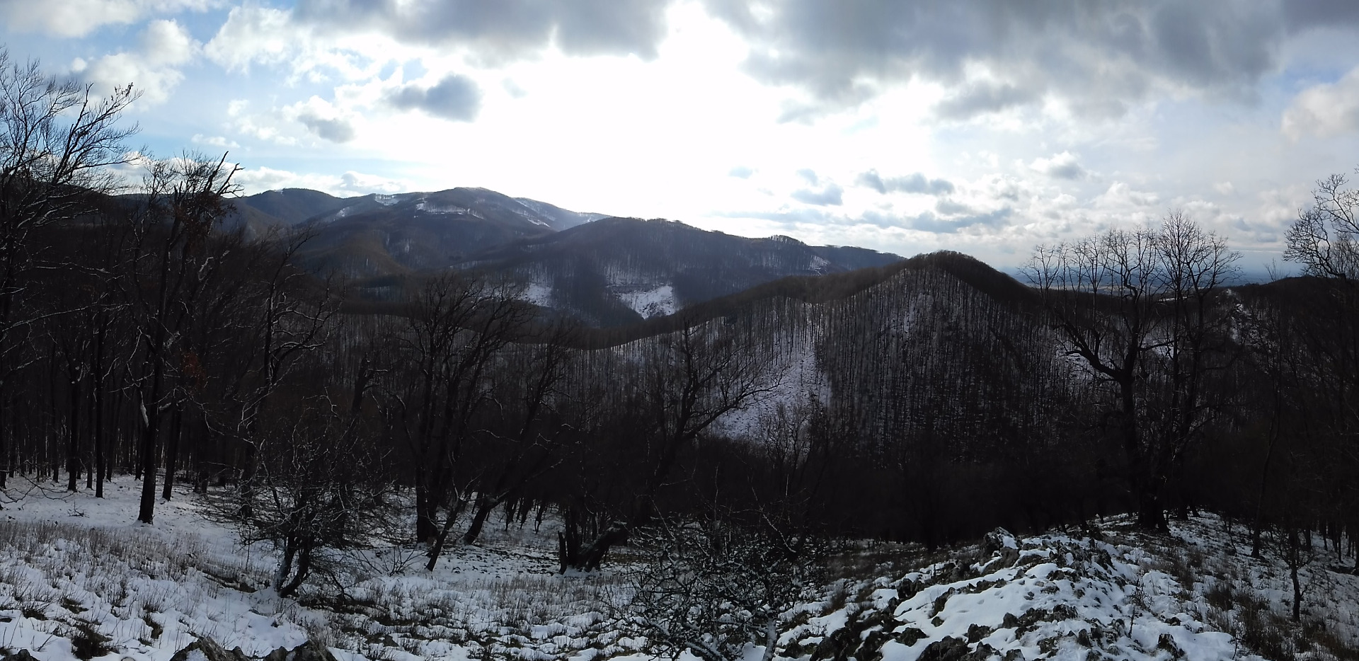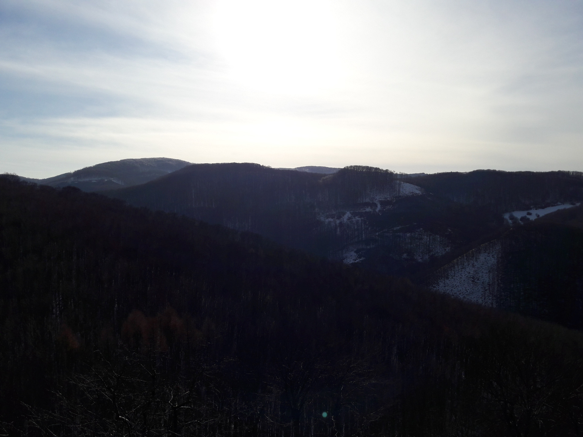 A výhľad na viaceré známe kopce, zľava Skalnatá a Čertov kopec, v strede Mešťanková, v popredí Ostrý vrch: