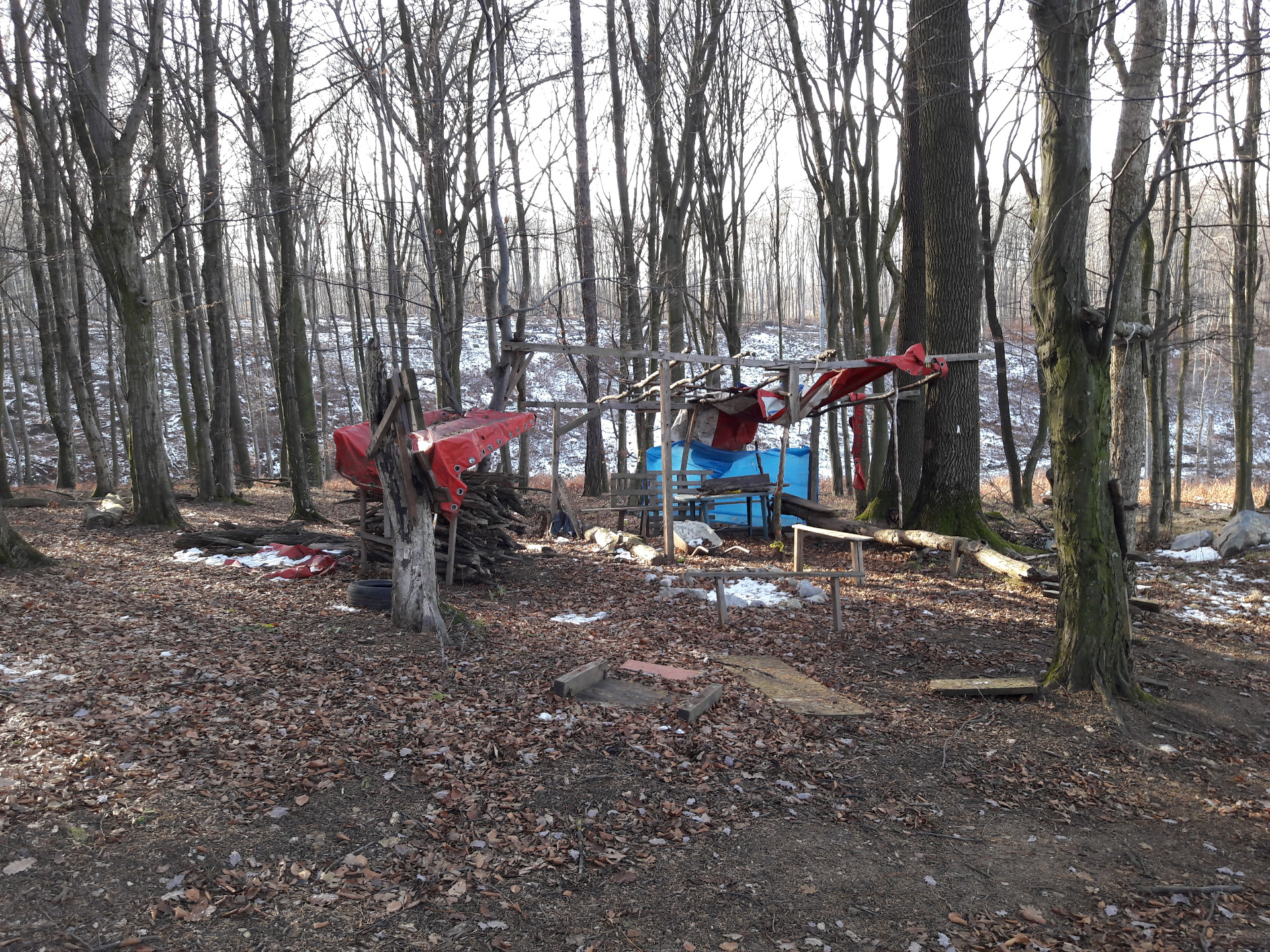 Hotovo, posledný kopec výpravy. Dnes sa už pôjde len dole kopcom. Cieľ je opäť obec Kuchyňa, kde sme štartovali pred dvoma dňami. Po ceste míňame pravdepodobne náchniapnú osadu "Red Bull". Partia, čo si tu postavila šiator, zrejme obľubuje nápoj Red Bull, lebo si vlastnoručne vyrobili drevené logo tejto značky.