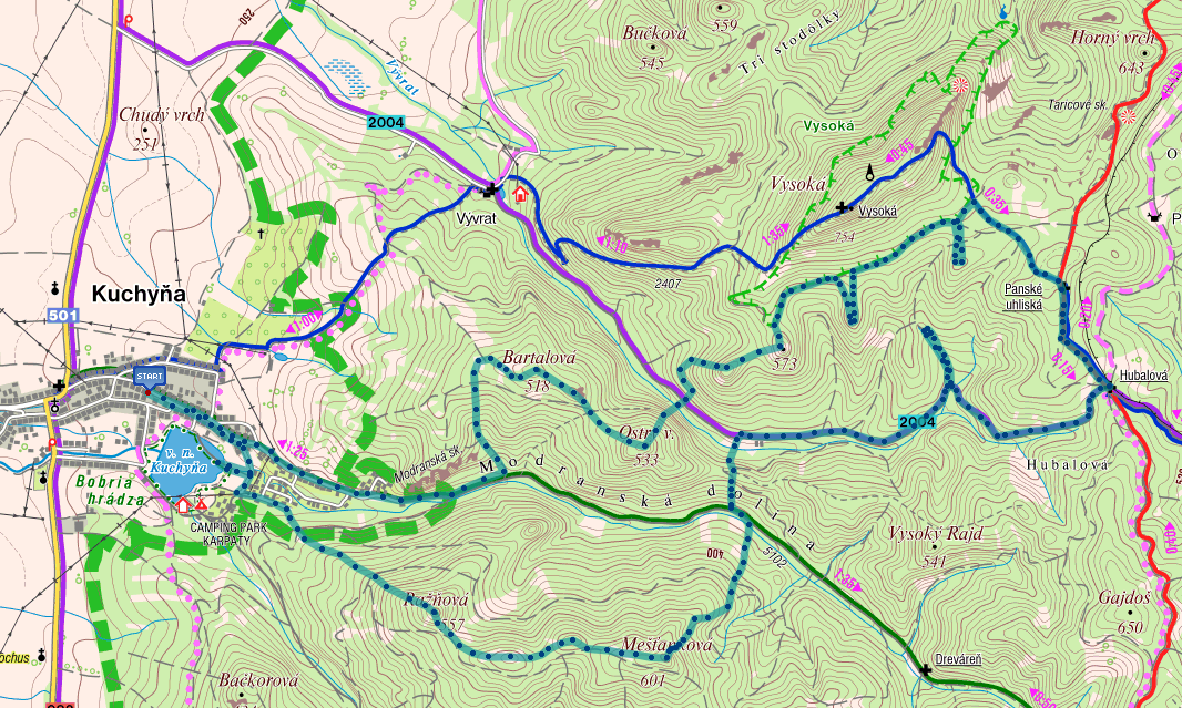 Kuchyňa - Bartalová - Ostrý vrch - Snežný vrch - kopec bez názvu č.1 - kopec bez názvu č.2 - Staré hlavy - Hubalová - trampská útulňa pod Vysokou - poľovnícka chata v doline potoka Vývrat - Mešťanková - kopec bez názvu č. 3 - kopec bez názvu č.4 - Ražňová